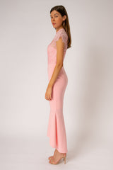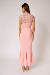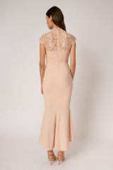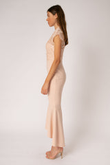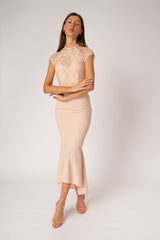 With high neck detailing, the Loya Dress is the perfect evening, formal and bridesmaid dress! This floor-grazing gown is crafted from textured crepe and spliced with embroidered floral lace through the bodice and sleeves. A draped fishtail hemline creates dramatic shape and movement with every step.