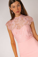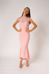 - Heavyweight crepe fabric; sheer lace upper body, lined through bust and skirt