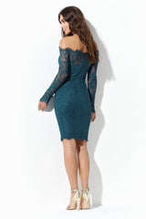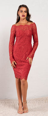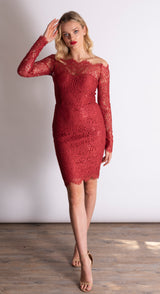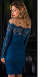 The elegant Tatiana Dress features an off the shoulder cut with a beautiful scalloped eyelash trim on neckline. Knee length in design with padded cups, this dress is sultry and sophisticated. Pair with black heels and high pony to show off the lace detailing for the luxe look.