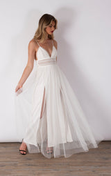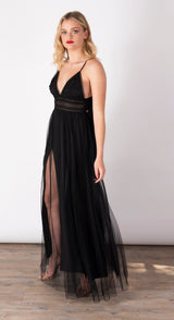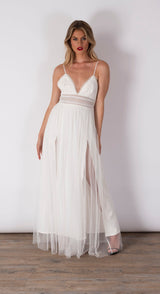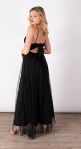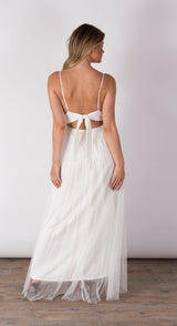 Whether you're looking for a more boho styled wedding dress, bridesmaid dresses or you are hosting a garden party the Athena Dress is perfect for you! Featuring soft a tulle full skirt, a lined lace connected bra top with a tie up back & a sheer waist band! Pair back with nude heels with soft curls!