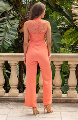 This elegant occasion pantsuit features a high neck lace detailing and dramatic wide leg silhouette. Featuring moulded hidden breast cups, waist belt and is made from a premium crepe fabric and lace.