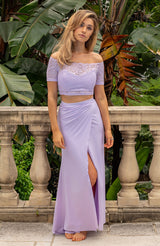 If you have a special event coming up and you want something unique, our Karla set is a perfect choice! The Karla is available in either baby blue or lilac with a top made from delicate sheer lace. You won't need to worry about matching a bra underneath as we have included the matching bralette with this set. The high waisted skirt is lined and features a front cross over hem with a small tail at the back. Complete the look with strappy nude heels.